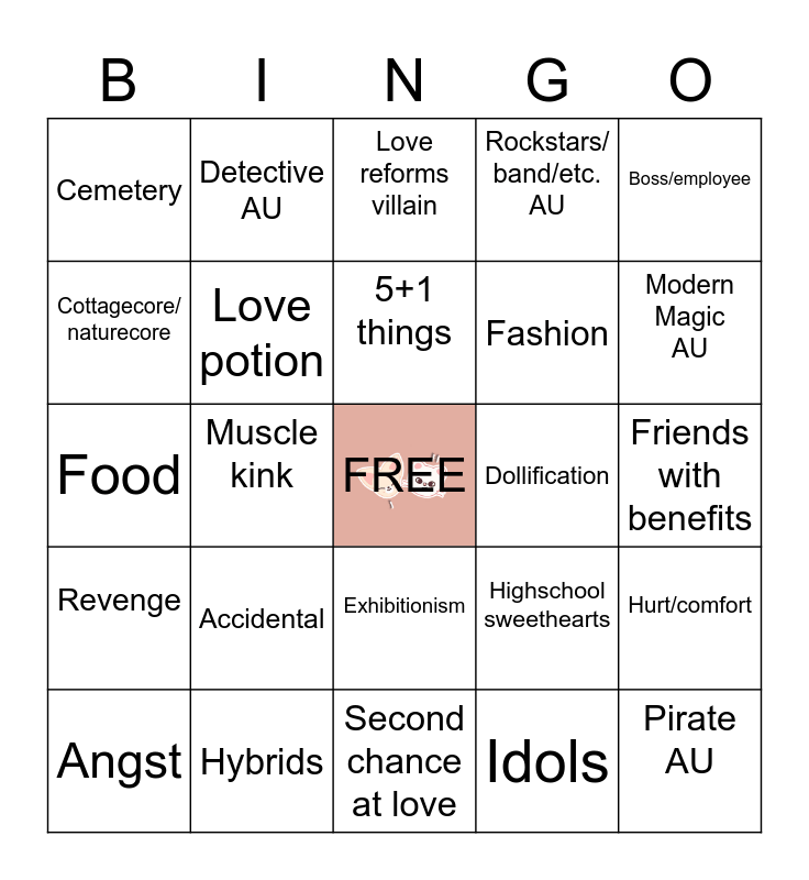 This bingo card has a free space and 24 words: Accidental, Hybrids, 5+1 things, Angst, Boss/employee, Cemetery, Cottagecore/ naturecore, Detective AU, Dollification, Exhibitionism, Fashion, Food, Highschool sweethearts, Hurt/comfort, Love potion, Idols, Friends with benefits, Love reforms villain, Modern Magic AU, Muscle kink, Pirate AU, Revenge, Rockstars/ band/etc. AU and Second chance at love.