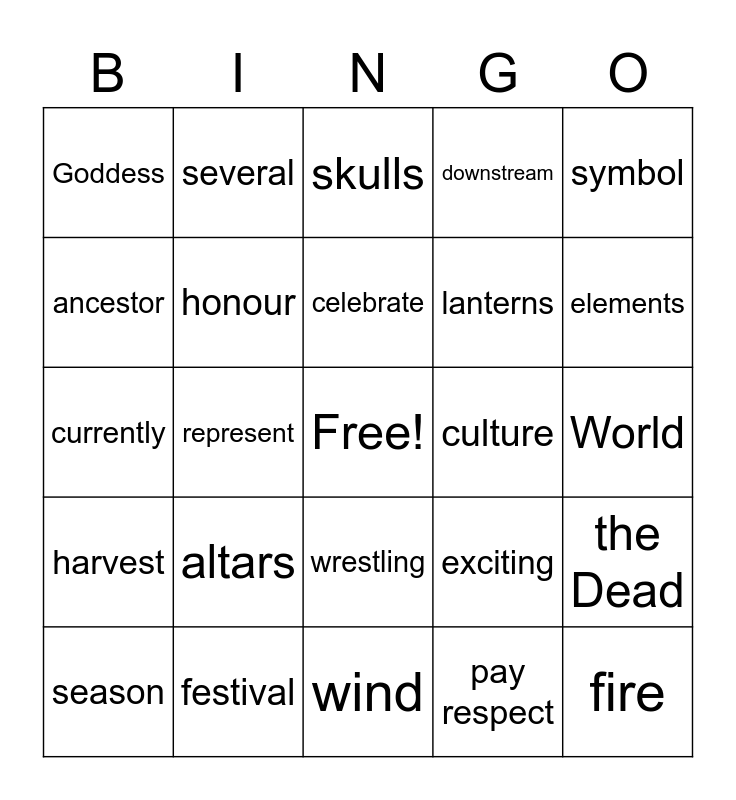 This bingo card has a free space and 24 words: altars, festival, celebrate, season, symbol, Goddess, ancestor, several, culture, wrestling, lanterns, currently, exciting, the Dead, honour, pay respect, World, skulls, elements, represent, fire, harvest, downstream and wind.