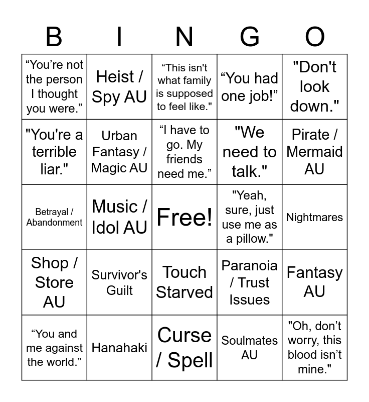 This bingo card has a free space and 61 words: Promises, Hanahaki, Major Character Death, Shop / Store AU, Soulmates AU, Hybrid AU, Urban Fantasy / Magic AU, "Show me where it hurts.", "We need to talk.", "I need to tell you something.", “You had one job!”, “Do me a favor, and don’t start a war while I’m gone.”, "You're a terrible liar.", “What are you so afraid of?”, "You had time to call for help. Why didn't you?", “You’re not the person I thought you were.”, "Oh, don’t worry, this blood isn’t mine.", "Don't look down.", “Why do you keep risking your life? To prove a point?”, “I have to go. My friends need me.”, "Yeah, sure, just use me as a pillow.", “This isn't what family is supposed to feel like.", “You and me against the world.”, Fantasy AU, (Post-)Apocalyptic AU, Royalty / Historical AU, Superhero / Superpowers AU, Winged AU, Pirate / Mermaid AU, Foster / Adoption AU, Supernatural / Mythical Creatures AU, Paranormal Activity / Investigators AU, Canon Divergence, Dragon Tamer / Monster Hunter AU, Heist / Spy AU, Time Travel / Loop AU, Folklore / Mythology AU, Music / Idol AU, Dancer / Skater AU, Betrayal / Abandonment, Tragic Backstory, Survivor's Guilt, Nightmares, Grief / Mourning, Paranoia / Trust Issues, Caught in a Storm, Sickness, Hiding an Injury, Truth Potion / Serum, Touch Starved, Curse / Spell, Role Swap / Body Swap, Protective Instincts, Prank War / Friendly Competition, Road Trip, Cooking Together, Birthday / Anniversary, Reunion, Love Languages, Mentor / Mentee and Found Family.