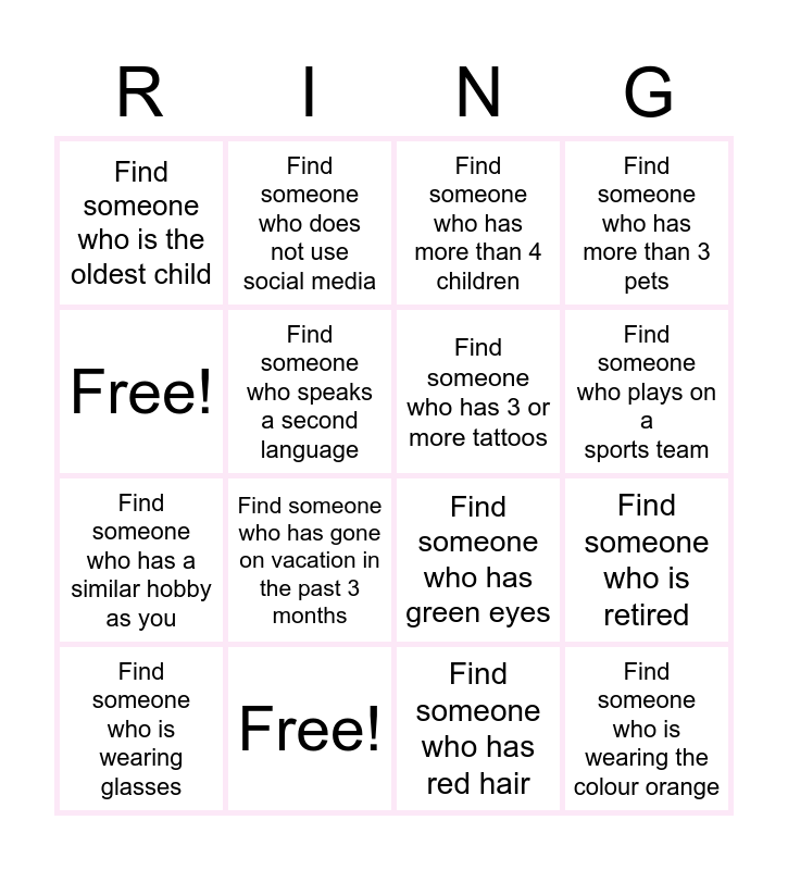 This bingo card has 28 words: Find someone who travelled over 50 km to be here, Find someone who has been married for over 10 years, Find someone who has a similar hobby as you, Find someone who is born in the same month as you, Find someone who speaks a second language, Find someone who has more than 4 children, Find someone who does not use social media, Find someone who is wearing the colour orange, Free!, Find someone who has the same favourite show, Find someone who has green eyes, Find someone who has more than 3 pets, Find someone who has an out of province driver's license, Find someone who is wearing contact lenses, Find someone who has gone on vacation in the past 3 months, Find someone who is wearing the longest dress, Find someone who is the youngest child, Find someone who has 3 or more tattoos, Find someone who plays on a sports team, Find someone who is an only child, Find someone who is the oldest child, Find someone who is newly married, Find someone who is wearing glasses, Find someone who is retired, Find someone who has red hair, Find someone who has gel nails, Free! and Find someone who is single.