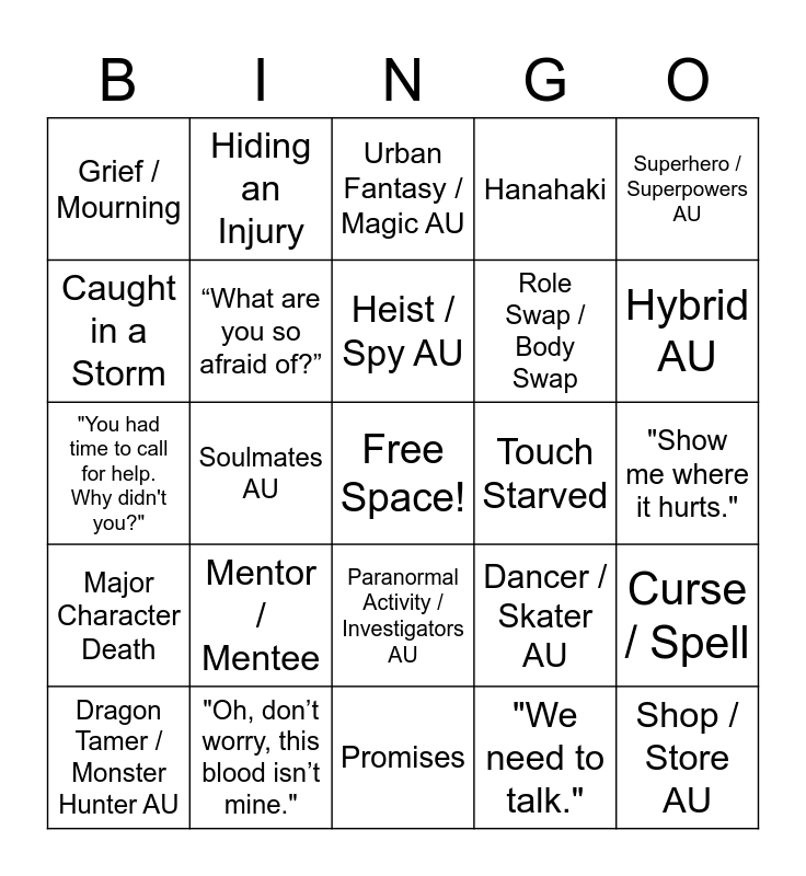 This bingo card has a free space and 24 words: Mentor / Mentee, "Oh, don’t worry, this blood isn’t mine.", Heist / Spy AU, Dragon Tamer / Monster Hunter AU, Superhero / Superpowers AU, Grief / Mourning, Caught in a Storm, Hiding an Injury, Touch Starved, Paranormal Activity / Investigators AU, Role Swap / Body Swap, "You had time to call for help. Why didn't you?", Dancer / Skater AU, Curse / Spell, “What are you so afraid of?”, "We need to talk.", "Show me where it hurts.", Urban Fantasy / Magic AU, Hybrid AU, Soulmates AU, Shop / Store AU, Major Character Death, Hanahaki and Promises.