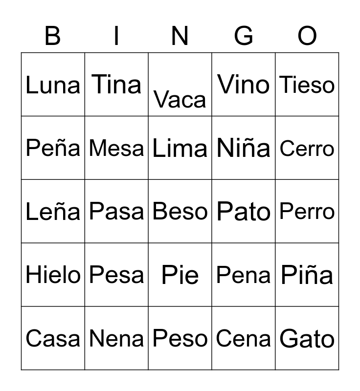 This bingo card has a free space and 29 words: Casa, Taza, Pasa, Vaso, Luna, Vaca, Mesa, Pesa, Pato, Nena, Perro, Gato, Peso, Cena, Cerro, Mano, Pie, Hielo, Tieso, Leña, Pena, Sapo, Niña, Peña, Vino, Tina, Piña, Lima and Prima.