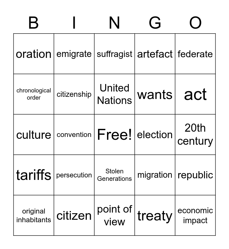 This bingo card has a free space and 98 words: democracy, colonisation, colony, 20th century, chronological, chronology, assimilate, society, refugee, Saigon, significant contribution, historical, inquiry, persecution, sequence, emigrate, culture, cultural groups, development, communism, diversity, communist, migrate, ancestry, immigrate, oration, point of view, perspective, populate or perish, historical inquiry, original inhabitants, chronological order, political reason, political impact, act, annotated timeline, artefact, constitutional, convention, commonwealth, constitutional monarchy, United Nations, wants, value, social impacts, Stolen Generations, social reason, inauguration, conference, significance, federal system, immigrant, guardianship, refugee, map, timeline, tariffs, secondary source, primary source, empathy, franchise, event, status, census, sources, discrimination, Congress, constitution, suffrage, delegate, suffragist, referendum, treaty, population, convention, law, judiciary, colonial structure, economic reason, economic impact, voting, citizenship, citizen, nation, trade, monarch, government, rights, republic, parliament, migrant, migration, culture, petition, election, federation, federate and Australia.