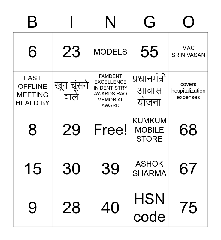 This bingo card has a free space and 75 words: EAST WEST NORTH SOUTH, BLACK FOREST, MODELS, CUSTOMIZED PRODUCTS, AUDIT, MAHINDRA & MAHINDRA, RECENTLY LAUNCED IPO, मसूड़े के दर्द, HSN code, LED Chandelier, कश्मीर से कन्याकुमारी, Cardboard Box, KUMKUM MOBILE STORE, covers hospitalization expenses, Stainless Steel Lock Nuts, खून चूंसने वाले, read all scheme related documents carefully, ASHOK SHARMA, Hard drives and disks., LAST OFFLINE MEETING HEALD BY, NEWLY ADDED MENTOR, FAMDENT EXCELLENCE IN DENTISTRY AWARDS RAO MEMORIAL AWARD, प्रधानमंत्री आवास योजना, MAC SRINIVASAN, 6, 21, 35, 51, 66, 7, 22, 36, 52, 67, 8, 23, 37, 53, 68, 9, 24, 38, 54, 69, 10, 25, 39, 55, 70, 11, 26, 40, 56, 71, 12, 27, 41, 57, 72, 13, 28, 42, 58, 73, 14, 29, 43, 59, 74, 15, 30, 44, 60, 75 and 45.