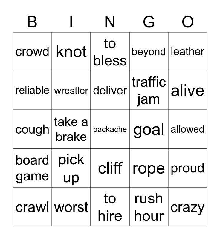 This bingo card has 40 words: sore throat, cough, tissues, wrestler, worst, cliff, deliver, tin can, leather, board game, take a brake, beyond, backache, allowed, goal, pick up, referee, crowd, headline, to bless, proud, rush hour, traffic jam, reliable, aisle, fare, to book, rank, crazy, abroad, earthquake, crawl, kind, rope, alive, to hire, e-rubbish, to melt, knot and delighted.