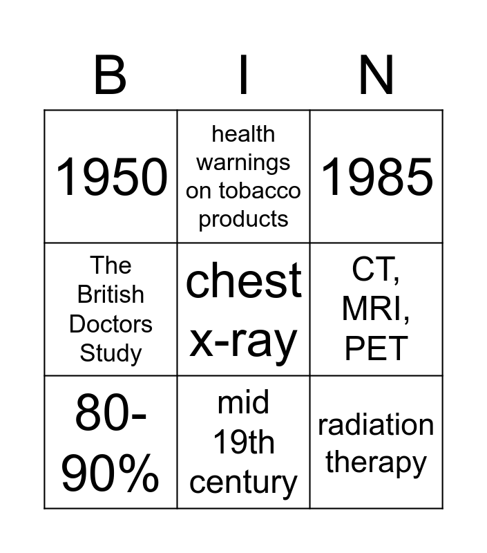 This bingo card has a free space and 11 words: smoking, mid 19th century, radiation therapy, 80-90%, health warnings on tobacco products, 1985, CT, MRI, PET, after 1900, The British Doctors Study, 1950 and surgery, radiotherapy, chemotherapy.