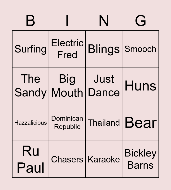 This bingo card has 20 words: Bear, Thatchers, Blings, Queer Eye, Ru Paul, The Sandy, Chasers, Surfing, Hazzalicious, Electric Fred, Dominican Republic, Thailand, Big Mouth, Bickley Barns, Just Dance, Pokemon Go, Huns, Smooch, Karaoke and Yaas Queen.