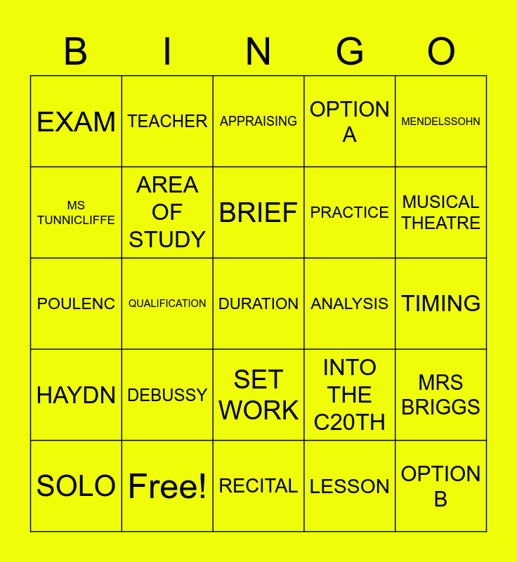 This bingo card has 30 words: Free!, MUSIC, QUALIFICATION, COMPOSITION, EXAM, APPRAISING, AREA OF STUDY, SET WORK, ANALYSIS, RECITAL, TIMING, DURATION, LESSON, OPTION B, MUSICAL THEATRE, WESTERN CLASSICAL TRADITION, INTO THE C20TH, HAYDN, DEBUSSY, MENDELSSOHN, POULENC, EDUQAS, TEACHER, PRACTICE, MS TUNNICLIFFE, OPTION A, MRS BRIGGS, SOLO, BRIEF and ESSAY.