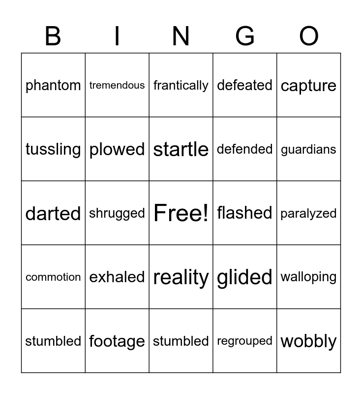 This bingo card has a free space and 24 words: stumbled, exhaled, startle, regrouped, capture, phantom, tremendous, frantically, flashed, paralyzed, darted, plowed, glided, walloping, tussling, footage, stumbled, defeated, guardians, commotion, shrugged, reality, defended and wobbly.