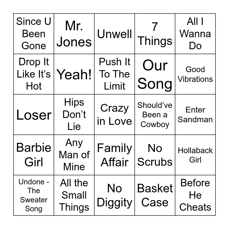 This bingo card has 88 words: What Is Love, One More Time, Family Affair, Bye Bye Bye, Beautiful Girls, Hotel Room Service, Californication, Umbrella, Bitter Sweet Symphony, Honky Tonk Badonkadonk, Wonderwall, Rockstar, Hollaback Girl, Enter Sandman, Without Me, Push It To The Limit, Crush, Friends in Low Places, Yellow, Telephone, Misery Business, Goodbye Earl, Loser, Oops… I Did It Again, Basket Case, Paper Planes, Hey There Delilah, Creep, Baby Got Back, Waterfalls, Unwell, 7 Things, Alive, I’ll Be There for You, Any Man of Mine, Drop It Like It’s Hot, Since U Been Gone, Smells Like Teen Spirit, Wannabe, Good Vibrations, Hips Don’t Lie, Learning to Fly, I Don’t Want To Be, No Scrubs, Should’ve Been a Cowboy, Buy U A Drank, Fergalicious, U Can’t Touch This, 1979, Our Song, SexyBack, The Boy is Mine, I Want it That Way, Breaking Free, What’s Up, Chicken Fried, Barbie Girl, Mr. Jones, Hot in Herre, Hey Ya!, Mr. Brightside, Get Ur Freak On, This Is Me, So What, She Thinks My Tractor’s Sexy, All the Small Things, Rehab, Yeah!, Undone - The Sweater Song, Crazy in Love, Before He Cheats, Tik Tok, Everlong, All I Wanna Do, Complicated, Say My Name, Sweet Escape, Strawberry Wine, No Diggity, Genie in a Bottle, Potential Breakup Song, Breakfast at Tiffany’s, You Oughta Know, Save a Horse, Ride a Cowboy, I Don’t Want To Miss a Thing, This Kiss, Man! I Feel Like a Woman! and Sk8ter Boi.