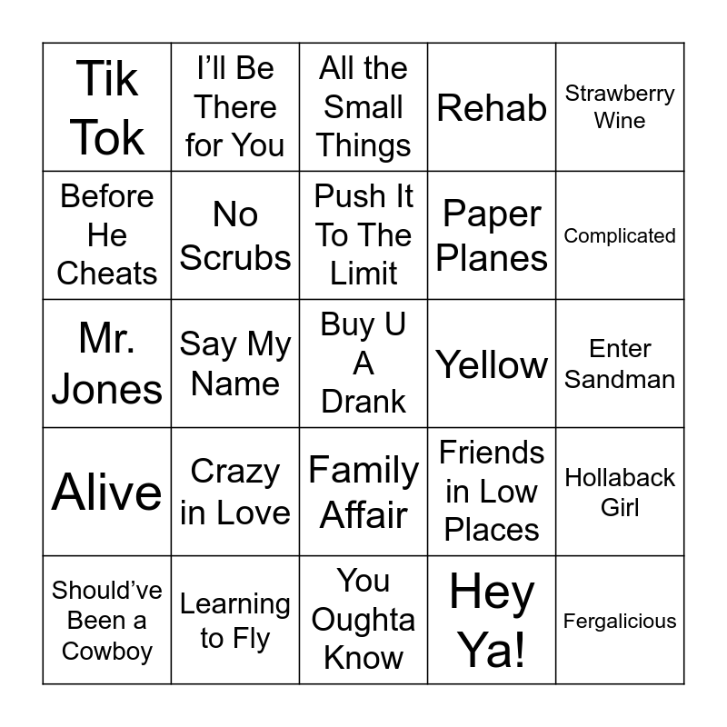 This bingo card has 88 words: What Is Love, One More Time, Family Affair, Bye Bye Bye, Beautiful Girls, Hotel Room Service, Californication, Umbrella, Bitter Sweet Symphony, Honky Tonk Badonkadonk, Wonderwall, Rockstar, Hollaback Girl, Enter Sandman, Without Me, Push It To The Limit, The Boy is Mine, I Want it That Way, Breaking Free, What’s Up, Chicken Fried, Barbie Girl, Mr. Jones, Hot in Herre, Hey Ya!, Mr. Brightside, Get Ur Freak On, This Is Me, So What, She Thinks My Tractor’s Sexy, All the Small Things, Rehab, Yeah!, Undone - The Sweater Song, Crazy in Love, Before He Cheats, Tik Tok, Everlong, All I Wanna Do, Complicated, Say My Name, Sweet Escape, Crush, Friends in Low Places, Yellow, Telephone, Misery Business, Goodbye Earl, Loser, Paper Planes, Hey There Delilah, Creep, Baby Got Back, Waterfalls, Unwell, 7 Things, Alive, I’ll Be There for You, Any Man of Mine, Drop It Like It’s Hot, Since U Been Gone, Smells Like Teen Spirit, Wannabe, Good Vibrations, Hips Don’t Lie, Learning to Fly, I Don’t Want To Be, No Scrubs, Should’ve Been a Cowboy, Buy U A Drank, Fergalicious, U Can’t Touch This, 1979, Strawberry Wine, No Diggity, Genie in a Bottle, Potential Breakup Song, Breakfast at Tiffany’s, You Oughta Know, Save a Horse, Ride a Cowboy, I Don’t Want To Miss a Thing, This Kiss, Man! I Feel Like a Woman!, Sk8ter Boi, Our Song, SexyBack, Oops… I Did It Again and Basket Case.