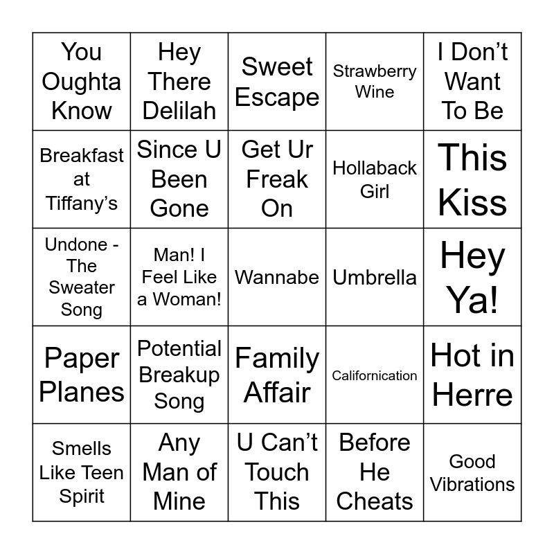 This bingo card has 88 words: What Is Love, One More Time, Family Affair, Bye Bye Bye, Beautiful Girls, The Boy is Mine, I Want it That Way, Breaking Free, What’s Up, Chicken Fried, Barbie Girl, Mr. Jones, Hot in Herre, Hey Ya!, Mr. Brightside, Get Ur Freak On, This Is Me, So What, She Thinks My Tractor’s Sexy, All the Small Things, Rehab, Yeah!, Undone - The Sweater Song, Crazy in Love, Before He Cheats, Tik Tok, Everlong, All I Wanna Do, Complicated, Say My Name, Sweet Escape, Strawberry Wine, No Diggity, Genie in a Bottle, Potential Breakup Song, Breakfast at Tiffany’s, You Oughta Know, Save a Horse, Ride a Cowboy, I Don’t Want To Miss a Thing, This Kiss, Man! I Feel Like a Woman!, Sk8ter Boi, Hotel Room Service, Californication, Umbrella, Bitter Sweet Symphony, Honky Tonk Badonkadonk, Wonderwall, Rockstar, Hollaback Girl, Enter Sandman, Without Me, Push It To The Limit, Crush, Friends in Low Places, Yellow, Paper Planes, Hey There Delilah, Creep, Baby Got Back, Waterfalls, Unwell, 7 Things, Alive, I’ll Be There for You, Any Man of Mine, Drop It Like It’s Hot, Since U Been Gone, Smells Like Teen Spirit, Wannabe, Good Vibrations, Hips Don’t Lie, Learning to Fly, I Don’t Want To Be, No Scrubs, Should’ve Been a Cowboy, Buy U A Drank, Fergalicious, U Can’t Touch This, 1979, Our Song, SexyBack, Telephone, Misery Business, Goodbye Earl, Loser, Oops… I Did It Again and Basket Case.