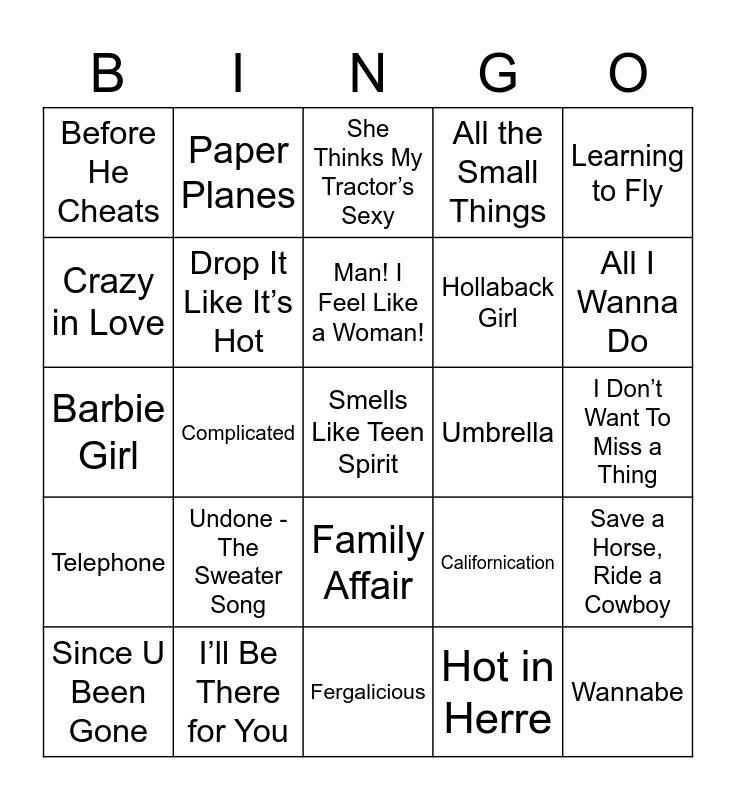 This bingo card has 88 words: What Is Love, One More Time, Family Affair, Bye Bye Bye, Beautiful Girls, Hotel Room Service, Strawberry Wine, No Diggity, Genie in a Bottle, Potential Breakup Song, Breakfast at Tiffany’s, You Oughta Know, Save a Horse, Ride a Cowboy, I Don’t Want To Miss a Thing, This Kiss, Man! I Feel Like a Woman!, Sk8ter Boi, The Boy is Mine, I Want it That Way, Breaking Free, What’s Up, Chicken Fried, Barbie Girl, Mr. Jones, Hot in Herre, Hey Ya!, Mr. Brightside, Get Ur Freak On, This Is Me, So What, She Thinks My Tractor’s Sexy, All the Small Things, Rehab, Yeah!, Undone - The Sweater Song, Crazy in Love, Before He Cheats, Tik Tok, Everlong, All I Wanna Do, Complicated, Say My Name, Sweet Escape, Californication, Umbrella, Bitter Sweet Symphony, Honky Tonk Badonkadonk, Wonderwall, Rockstar, Hollaback Girl, Enter Sandman, Without Me, Push It To The Limit, Crush, Friends in Low Places, Yellow, Telephone, Paper Planes, Hey There Delilah, Creep, Baby Got Back, Waterfalls, Unwell, 7 Things, Alive, I’ll Be There for You, Any Man of Mine, Drop It Like It’s Hot, Since U Been Gone, Smells Like Teen Spirit, Wannabe, Good Vibrations, Hips Don’t Lie, Learning to Fly, I Don’t Want To Be, No Scrubs, Should’ve Been a Cowboy, Buy U A Drank, Fergalicious, U Can’t Touch This, 1979, Our Song, SexyBack, Misery Business, Goodbye Earl, Loser, Oops… I Did It Again and Basket Case.