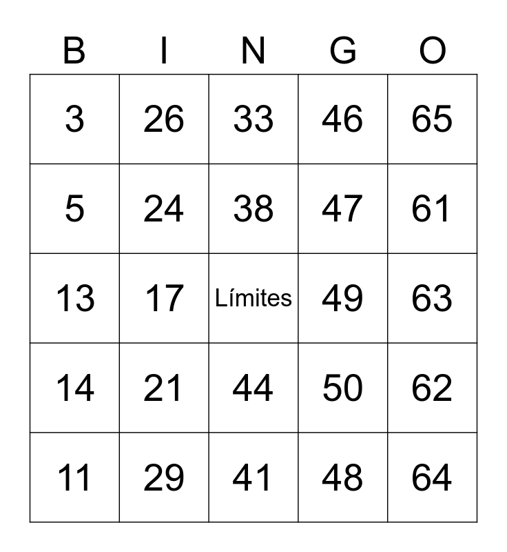 This bingo card has a free space and 55 words: 1, 16, 31, 46, 61, 2, 17, 32, 47, 62, 3, 18, 48, 63, 4, 19, 33, 49, 64, 5, 20, 34, 50, 65, 6, 21, 35, 7, 22, 36, 8, 23, 37, 9, 24, 38, 10, 25, 39, 11, 26, 40, 12, 27, 41, 13, 28, 42, 14, 29, 43, 15, 30, 44 and 45.