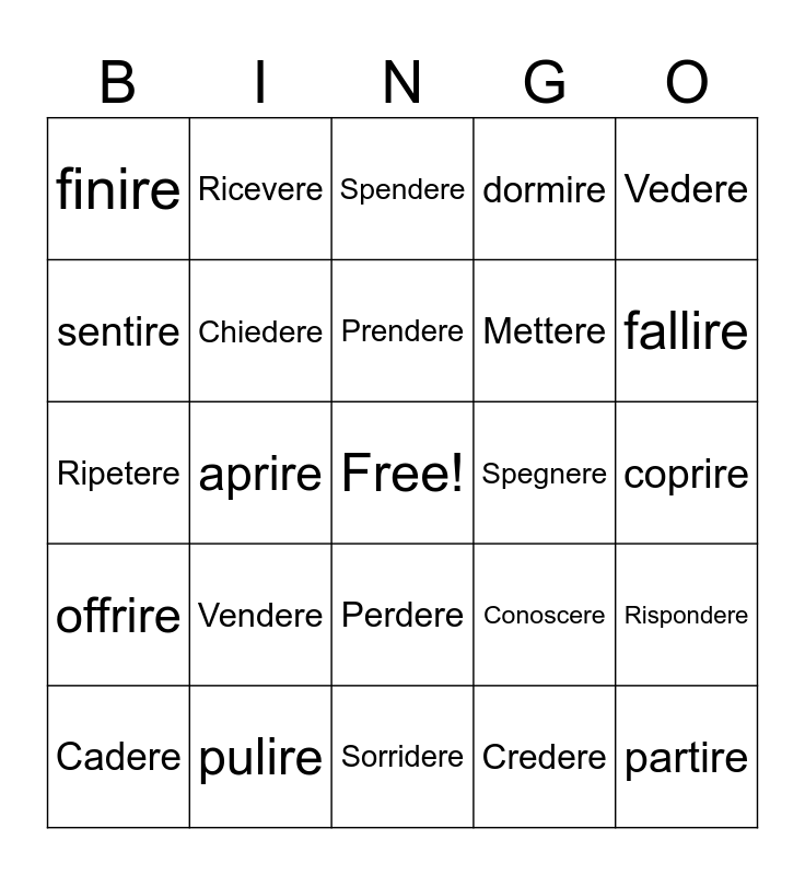 This bingo card has a free space and 38 words: Correre, leggere, scrivere, Chiedere, Rispondere, Vendere, Prendere, Chiudere, Vedere, Mettere, aprire, dormire, partire, coprire, sentire, offrire, Servire, Spendere, Accendere, Spegnere, finire, pulire, fallire, Cadere, Crescere, Sorridere, Ridere, Piangere, Rompere, Godere, Vincere, Perdere, Credere, Ricevere, Vivere, Conoscere, Ripetere and divertire.
