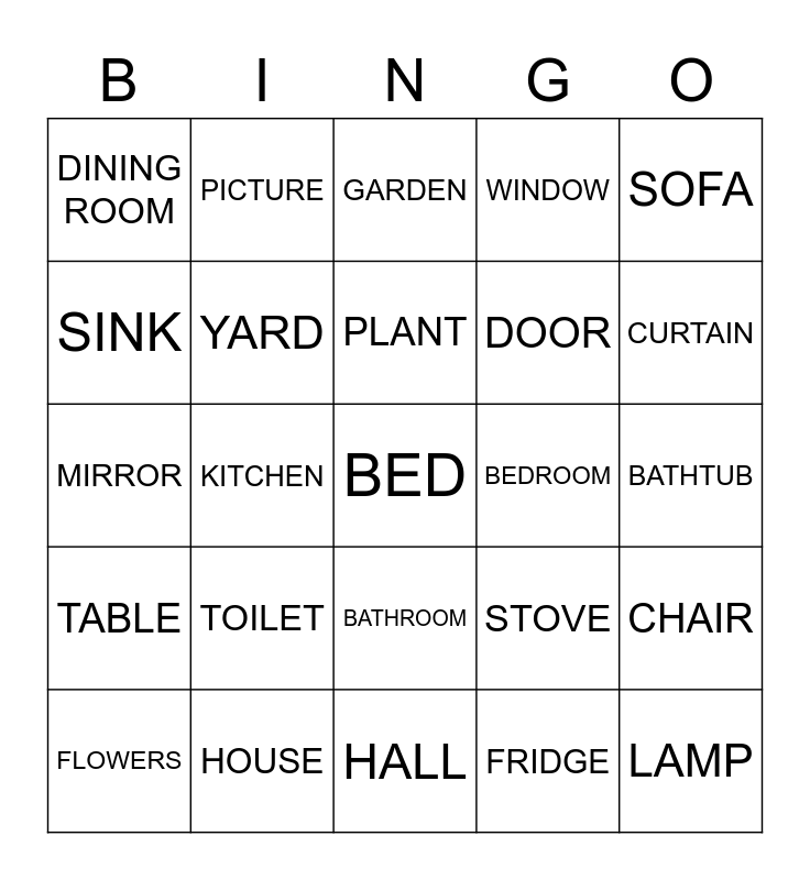 This bingo card has 30 words: HOUSE, APARTMENT, KITCHEN, LIVING ROOM, DINING ROOM, GARDEN, YARD, BATHROOM, BEDROOM, HALL, BATHTUB, BED, FRIDGE, LAMP, CURTAIN, SHOWER, STOVE, TABLE, TOILET, SOFA, MIRROR, CABINET, PICTURE, DOOR, SINK, WINDOW, CHAIR, FLOWERS, PLANT and CLOCK.