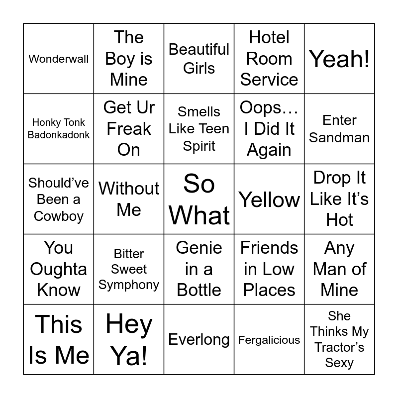 This bingo card has 88 words: Strawberry Wine, No Diggity, Genie in a Bottle, Paper Planes, Hey There Delilah, Creep, Baby Got Back, Waterfalls, Unwell, 7 Things, Alive, I’ll Be There for You, Any Man of Mine, Drop It Like It’s Hot, Since U Been Gone, Smells Like Teen Spirit, Wannabe, Good Vibrations, Hips Don’t Lie, Learning to Fly, I Don’t Want To Be, No Scrubs, Should’ve Been a Cowboy, Buy U A Drank, Fergalicious, U Can’t Touch This, What Is Love, One More Time, Family Affair, Bye Bye Bye, Beautiful Girls, Hotel Room Service, Californication, Umbrella, Bitter Sweet Symphony, Honky Tonk Badonkadonk, Wonderwall, Rockstar, Hollaback Girl, Enter Sandman, Without Me, Push It To The Limit, Crush, Friends in Low Places, Yellow, Telephone, Misery Business, Goodbye Earl, Loser, Oops… I Did It Again, Basket Case, 1979, Our Song, SexyBack, Potential Breakup Song, Breakfast at Tiffany’s, You Oughta Know, The Boy is Mine, I Want it That Way, Breaking Free, What’s Up, Chicken Fried, Barbie Girl, Mr. Jones, Hot in Herre, Hey Ya!, Mr. Brightside, Get Ur Freak On, This Is Me, So What, She Thinks My Tractor’s Sexy, All the Small Things, Rehab, Yeah!, Undone - The Sweater Song, Crazy in Love, Before He Cheats, Tik Tok, Everlong, All I Wanna Do, Complicated, Say My Name, Sweet Escape, Save a Horse, Ride a Cowboy, I Don’t Want To Miss a Thing, This Kiss, Man! I Feel Like a Woman! and Sk8ter Boi.