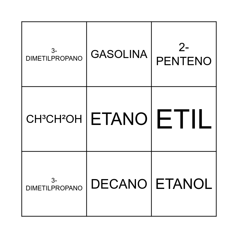 This bingo card has a free space and 13 words: ETIL, PROPANO, 3- DIMETILPROPANO, GASOLINA, CH³CH²OH, ETANOL, 1- METILBUTANO, CH³CH²OH, DECANO, 3- DIMETILPROPANO, ETIL, 2- PENTENO and 1- METILBUTANO.