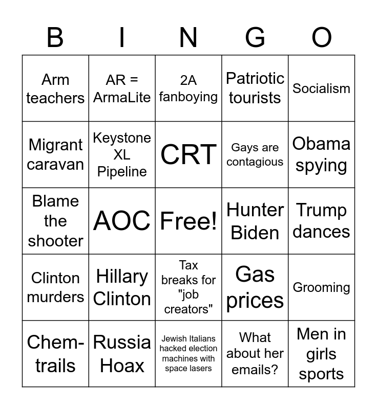 This bingo card has a free space and 24 words: Hillary Clinton, Russia Hoax, CRT, Chem-trails, Socialism, Arm teachers, Migrant caravan, AR = ArmaLite, Hunter Biden, Tax breaks for "job creators", Gays are contagious, Blame the shooter, Gas prices, Grooming, Keystone XL Pipeline, What about her emails?, Trump dances, 2A fanboying, Obama spying, AOC, Men in girls sports, Clinton murders, Patriotic tourists and Jewish Italians hacked election machines with space lasers.