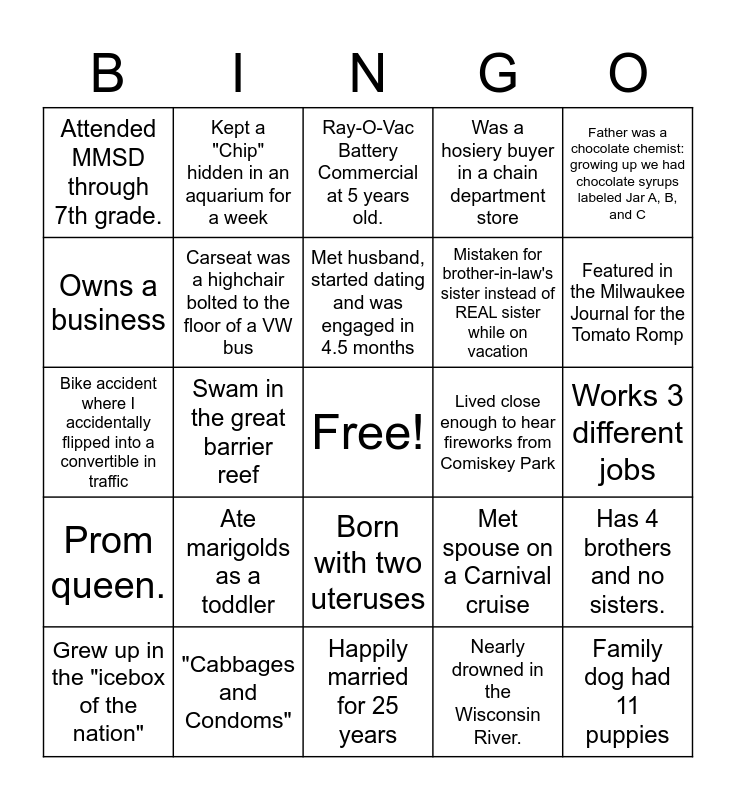 This bingo card has a free space and 91 words: Born in Germany, Crewed a hot air balloon, Born with two uteruses, Never paid to go see a movie, Married my high school sweetheart, Part time student at UW Law School, Swiss citizen, Writer for the Waunakee Tribune, Is an artist, Bought my house from Gov. Scott McCallum, Trained in pediatric hypnosis, Was in a dance group, Had a snake loose in my house, Works 3 different jobs, Loves to read., Met husband, started dating and was engaged in 4.5 months, Ham Radio Operator, Lived in the Philippines until I was 2, Wants to be a certified forest bathing therapist, Godzilla fan, Is a poet., Has volunteered in 4 different third world countries, Happily married for 25 years, Once bred guinea pigs, Bike accident where I accidentally flipped into a convertible in traffic, "Cabbages and Condoms", Drives motorcycles, Has been sky diving, Keeps a jar of peanut butter in their car., Middle name is Alice, Wanted to be a teacher, but "accidentally" became a school nurse., Has 4 brothers and no sisters., Practices Folkloric Dances, Prom queen., Attended MMSD through 7th grade., Was a hosiery buyer in a chain department store, Ray-O-Vac Battery Commercial at 5 years old., Has been on the Price is Right, Swam in the great barrier reef, Featured in the Milwaukee Journal for the Tomato Romp, Grew up in the "icebox of the nation", Owns a business, Allergic to shellfish, Lieutenant in the army, Saving to buy an Airstream trailer, Met spouse on a Carnival cruise, Crowd-surfed in a 13x14 bedroom, House fire, Got stuck in clay as a toddler, Lived in 3 states before college 18., Temper Tantrum about tying shoelaces led to a football signed by Packers kicker, Mistaken for brother-in-law's sister instead of REAL sister while on vacation, Family adopted a little boy from Korea when I was 13 years old, Woke up at 2am for family fishing and drove the boat, German summer visits with relatives every few years, "Junk food supper" as a kid, Lived close enough to hear fireworks from Comiskey Park, Mom was one of the first 6 police women in Madison., During a dance routine, my belt to my dress starting coming off and an audience member had to come put it back on me because I kept dancing., Fell out of a tree, and blacked out., Saved father from severe asthma attack by calling 911 at 7 years old, Run over by brother on a tractor, Vomited after taking a cast off a broken arm. Twice, Grew up in a town that had a serial killer, Has a Christmas picture of self sitting on a water buffalo, Was in love with David Cassidy from the Partridge Family, Dad used to make me dandelion crowns., Nearly drowned in the Wisconsin River., Instead of a lemonade stand, I had a "come look at my fish" stand, Went to california for one summer on a Greyhound bus, Ate marigolds as a toddler, Family dog had 11 puppies, As a kid, chased farmer's trucks on bikes and pulled peapod vines off the back, Dad drag raced and our car was named "Booger Bayer", Kept a "Chip" hidden in an aquarium for a week, Carseat was a highchair bolted to the floor of a VW bus, "Potty accident" because asking the nun to go was terrifying, Best handwriting in 2nd grade, Was a very mean kid, Spent Memorial Day to Labor Day 1972 in Alaska with family., In a Pizza Pit commercial in 3rd grade, Father was a chocolate chemist: growing up we had chocolate syrups labeled Jar A, B, and C, Dad dressed up in a gorilla suit and chased us around the house, Met husband at 19. Lived across the street as babies, Family bred hedgehogs, Had a pet racoon, Bungee jumping when I was 12, Fed a doll with my protein milk until she was rotten, Broke my ankle sledding in middle school and walked on it for a week, Barely spoke in 4k and Learned to drive BEFORE riding a bike.