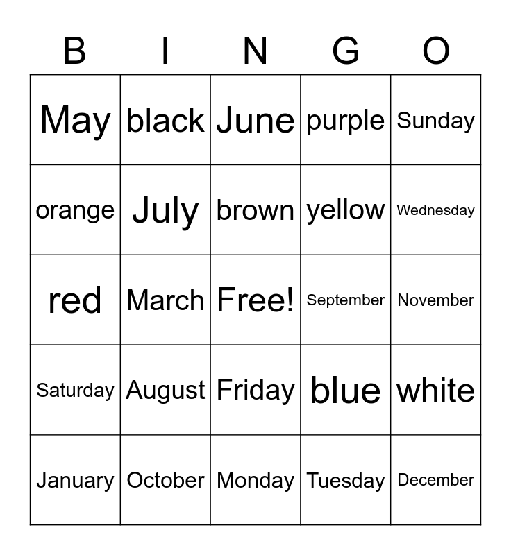 This bingo card has a free space and 29 words: January, February, March, April, May, June, July, August, September, October, November, December, Monday, Tuesday, Wednesday, Thursday, Friday, Saturday, Sunday, red, blue, green, yellow, orange, purple, black, white, brown and beige.