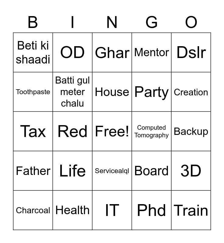 This bingo card has a free space and 24 words: Life, Health, House, Charcoal, Dslr, Beti ki shaadi, Toothpaste, OD, Computed Tomography, Servicealql, Party, Tax, Board, 3D, Batti gul meter chalu, Phd, Backup, Ghar, Creation, Red, Train, Father, Mentor and IT.