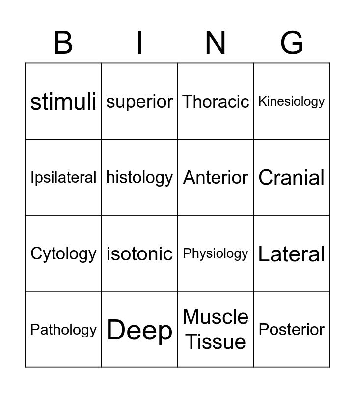This bingo card has 32 words: Dorsal, Ventral, Lateral, Medial, Posterior, Anterior, Ipsilateral, Contralateral, superior, Inferior, Cranial, Thoracic, Abdominal, Superficial, Deep, Anatomical position, Anatomy, Physiology, Kinesiology, Gross Anatomy, Nervous Tissue, Connective Tissue, Muscle Tissue, Epithelial Tissue, Pathology, Kinesiology, Cytology, histology, stimuli, synapse, isometric and isotonic.