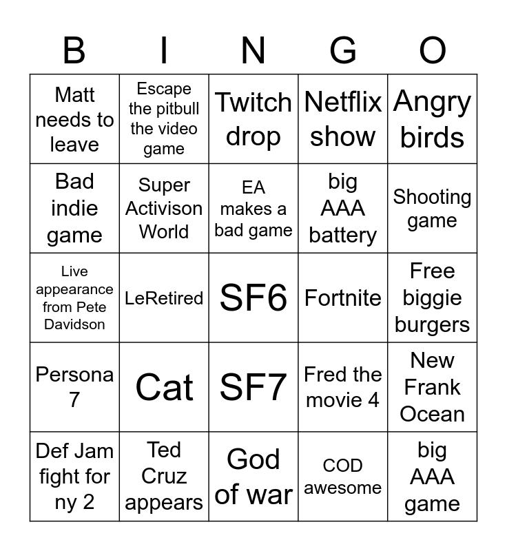 This bingo card has a free space and 54 words: Games, Persona 7, Persona 5 Arena, Jeff Keely Amog us, SF7, Metal Gear 6, Netflix show, Bad anime game, Bad indie game, Boring game, Matt needs to leave, Matt misses the ball in rocket league, Ted Cruz appears, Def Jam fight for ny 2, Indie game about photography (senors fav), God of war, big AAA game, big AAA battery, Biggie comes back to life, Free biggie burgers, Fred the movie 4, One piece fighting game, Fortnite, Angry birds, Harold and Kumar go to a concentration camp, Escape the pitbull the video game, John Cena, Special performance from Weezer, Overwatch 2, COD awesome, Fall guys free, Fall guys 3, January 6th the game, Latinx, Twitch drop, Sonic bad, Live appearance from Pete Davidson, New Frank Ocean, Mario Kart 9, Super Activison World, FNAF 3, Imagine Dragons Oh the Misery Performance, Battle Pass, Jungle A, Cat, Ben talking dog 2, Racing Game, Sports Game Wooo, EA makes a bad game, LeRetired, Shooting game, Stove leaves part way through, Stove gets mad like a sissy and 1.