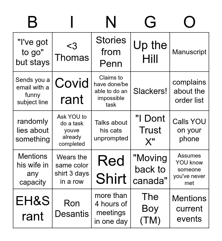 This bingo card has 44 words: Leaves before 4pm and doesnt return, Talks about his cats unprompted, ACS rant, EH&S rant, Chop! Chop!, The Boy (TM), Stories from Penn, mispronounces a word, Manuscript, Ron Desantis, Up the Hill, "I Dont Trust X", Red Shirt, Wears the same color shirt 3 days in a row, Not red or teal shirt, more than 4 hours of meetings in one day, complains about paperwork, randomly lies about something, Blames YOU for something you didnt do, complains about the order list, <3 Thomas, Asks YOU for help looking for something, Walks away mid conversation, "I've got to go" but stays, sends YOU the thumbs up emoji, Calls YOU on your phone, cat "tweets", Complains about the supply chain, "Moving back to canada", Mentions his wife in any capacity, Complains about male grad student absence, Assumes YOU know someone you've never met, "you didnt hear this from me", Gossips about someone in academica, Ask YOU to do a task youve already completed, Wears a mask on his head, "Youre trying to get me fired/imprissoned!", Mentions current events, Claims to have done/be able to do an impossible task, Sends you a email with a funny subject line, Slackers!, long winded explaination on why he doesnt do/use something anymore, Covid rant and "They don't know what theyre talking about".