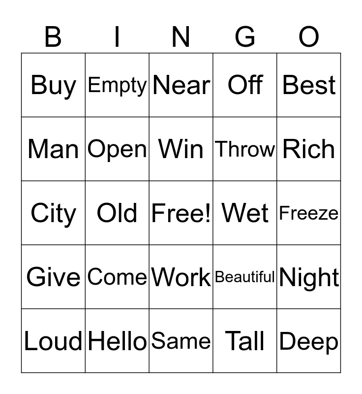 This bingo card has a free space and 24 words: Come, Hello, Win, Loud, Best, Buy, Man, Empty, Wet, Work, Throw, City, Beautiful, Night, Open, Tall, Freeze, Near, Rich, Old, Deep, Give, Off and Same.