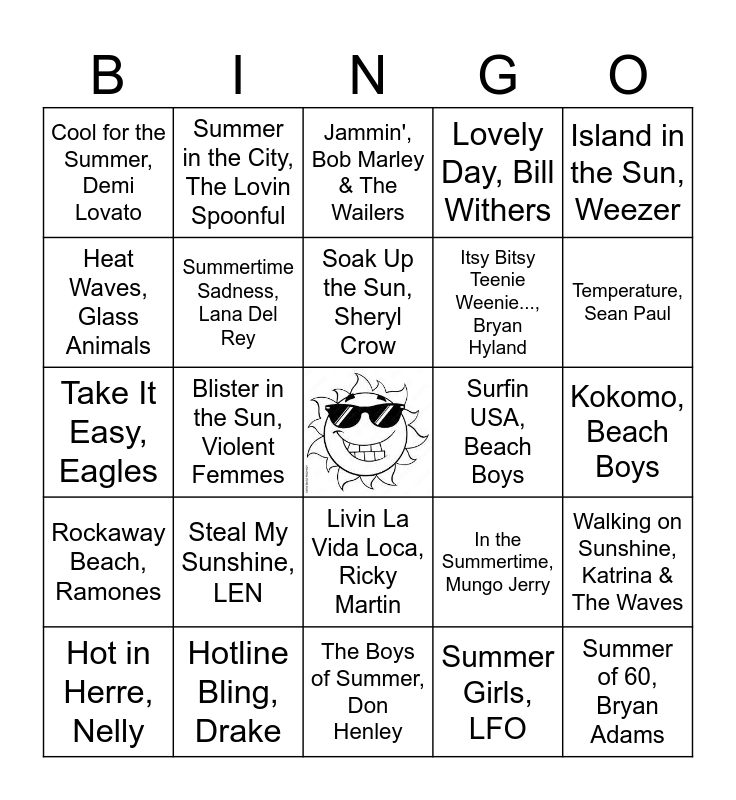 This bingo card has a free space and 53 words: Summer, Calvin Harris, Summer of 60, Bryan Adams, Miami, Will Smith, Summer Girls, LFO, Steal My Sunshine, LEN, School's Out, Alice Cooper, Summer in the City, The Lovin Spoonful, Here Comes the Sun, The Beatles, Heat Waves, Glass Animals, Summertime, DJ Jazzy Jeff & Fresh Prince, Summertime Sadness, Lana Del Rey, Summer Nights, John Travolta & Olivia Newton John, Walking on Sunshine, Katrina & The Waves, In the Summertime, Mungo Jerry, Hot Stuff, Donna Summer, Hot in Herre, Nelly, Soak Up the Sun, Sheryl Crow, Surfin USA, Beach Boys, California Gurls, Katy Perry & Snoop Dogg, Island in the Sun, Weezer, Blister in the Sun, Violent Femmes, All Summer Long, Kid Rock, Itsy Bitsy Teenie Weenie..., Bryan Hyland, Cool for the Summer, Demi Lovato, Hot Blooded, Foreigner, Hotline Bling, Drake, Hot N Cold, Katy Perry, Heat of the Moment, Asia, This is Why I'm Hot, MiMS, Temperature, Sean Paul, Champagne & Sunshine, PLVTINUM, Under the Boardwalk, The Drifters, Toes, Zac Brown Band, Vacation, The Go-Go's, Summertime, Louis Armstrong & Ella Fitzgerald, Margaritaville, Jimmy Buffet, Lovely Day, Bill Withers, The Boys of Summer, Don Henley, Jammin', Bob Marley & The Wailers, Sunshine of Your Love, Cream, Sunflower, Post Malone, Aquarius/Let The Sunshine, The 5th Dimension, Kokomo, Beach Boys, Sittin On The Dock of the Bay, Otis Redding, California Dreamin, Mamas and the Papas, Livin La Vida Loca, Ricky Martin, All I Wanna Do, Sheryl Crow, California Love, 2Pac, Take It Easy, Eagles, Rockaway Beach, Ramones, Cruel Summer, Bananarama, Summertime, Kenny Chesney and Cruel Summer, Taylor Swift.
