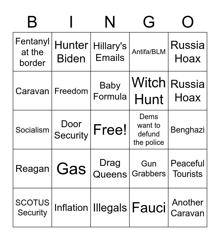 This bingo card has a free space and 24 words: Gas, Inflation, Baby Formula, SCOTUS Security, Russia Hoax, Fentanyl at the border, Caravan, Hunter Biden, Dems want to defund the police, Drag Queens, Witch Hunt, Socialism, Gun Grabbers, Peaceful Tourists, Freedom, Fauci, Benghazi, Hillary's Emails, Russia Hoax, Door Security, Another Caravan, Reagan, Antifa/BLM and Illegals.