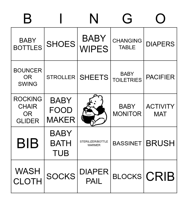 This bingo card has a free space and 37 words: PLAY YARD, BABY TOWELS, SWADDLER BLAKET, STROLLER, BRUSH, BABY BATH TUB, SHEETS, HATS, DIAPERS, BOOKS, BABY FOOD MAKER, CHANGING TABLE, CRIB, ACTIVITY MAT, BOUNCER OR SWING, BIB, INFANT CAR SEAT, BABY WIPES, STERILIZER/BOTTLE WARMER, BABY MONITOR, BABY BOTTLES, PACIFIER, WASH CLOTH, DIAPER PAIL, NURSING SUPPLIES, BLOCKS, SHOES, DIAPER BAG, ONESIES, BLANKET, WHITE NOISE MACHINE, SOCKS, ROCKING CHAIR OR GLIDER, HIGH CHAIR, BASSINET, BABY TOILETRIES and STUFFED TOY.