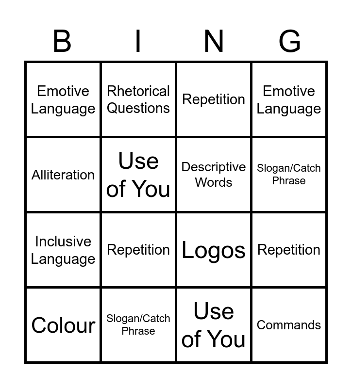 ⚠ This card has duplicate items: Colour (3), Ethos (3), Pathos (3), Logos (3), Rhetorical Questions (5), Repetition (3), Alliteration (3), Hyperbole (3), Emotive Language (3), Slogan/Catch Phrase (3), Use of You (3), Inclusive Language (3), Technical Language (2), Descriptive Words (2), Commands (2)