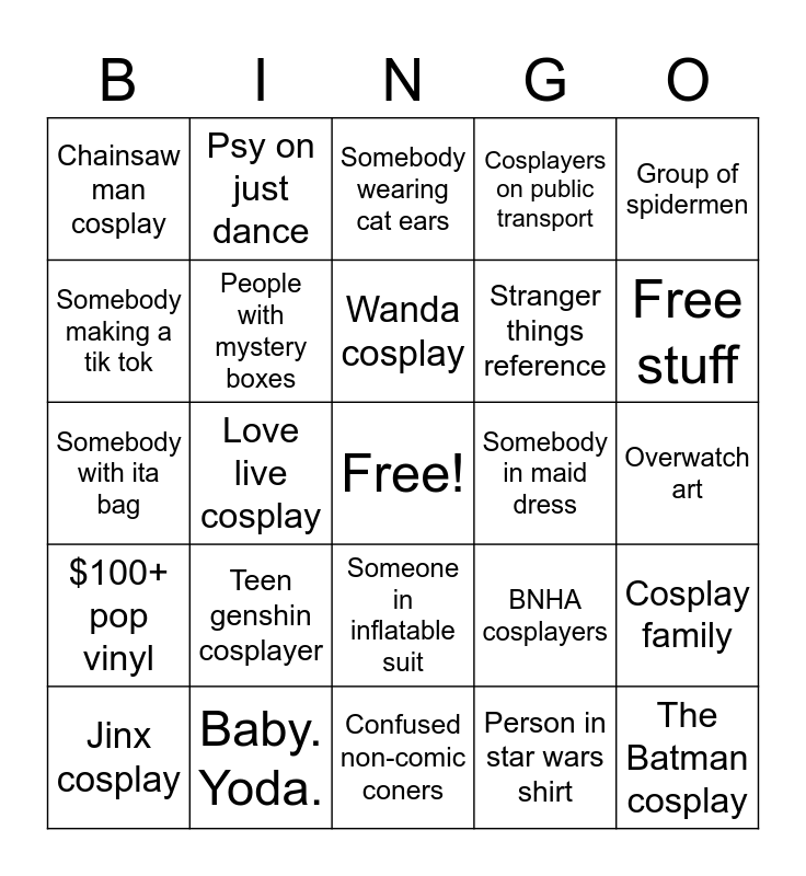 This bingo card has a free space and 24 words: Teen genshin cosplayer, Baby. Yoda., Wanda cosplay, Jinx cosplay, Group of spidermen, Chainsaw man cosplay, Somebody making a tik tok, Psy on just dance, Somebody in maid dress, Someone in inflatable suit, Stranger things reference, Somebody with ita bag, BNHA cosplayers, Cosplay family, People with mystery boxes, Person in star wars shirt, Overwatch art, Somebody wearing cat ears, Free stuff, Love live cosplay, The Batman cosplay, $100+ pop vinyl, Cosplayers on public transport and Confused non-comic coners.