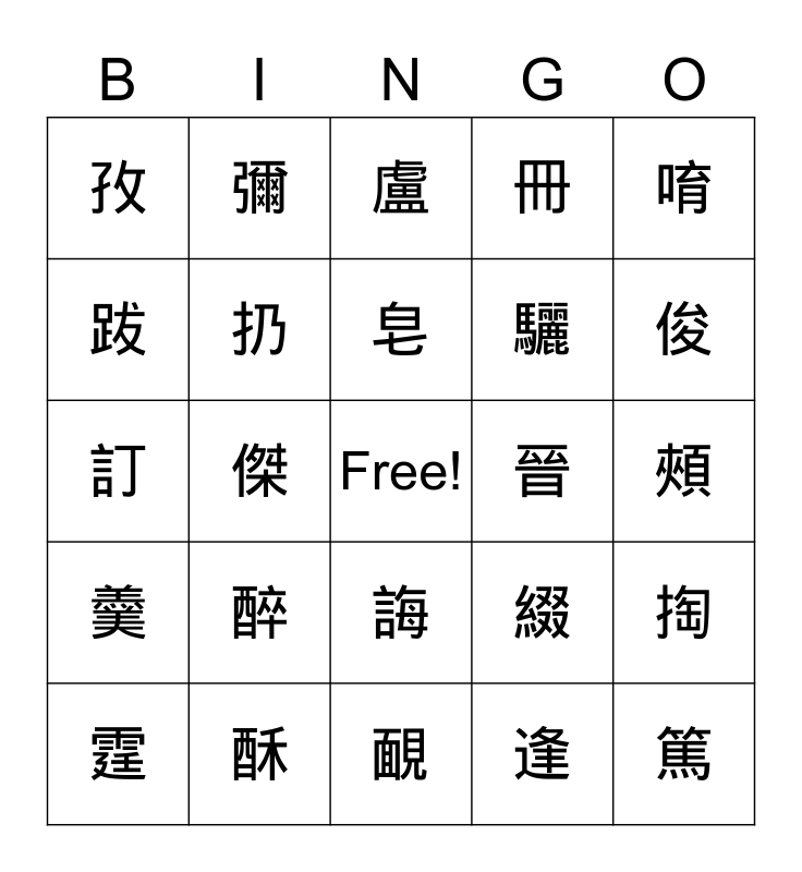 This bingo card has a free space and 24 words: 醉, 酥, 皂, 霆, 唷, 孜, 跋, 彌, 晉, 誨, 驪, 訂, 綴, 掏, 扔, 逢, 頰, 盧, 俊, 傑, 篤, 羹, 冊 and 靦.