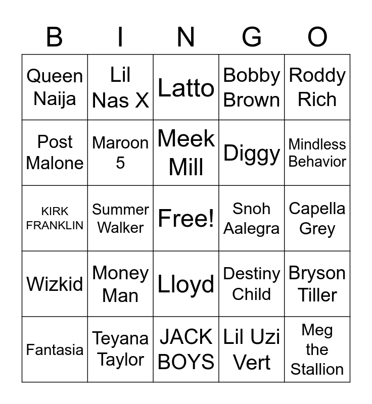 This bingo card has a free space and 77 words: Lil Baby, Lil Durk, Latto, TLC, Ariana Grande, Future, Lor Scoota, SZA, Aaliyah, Whitney Houston, Drake, New Edition, Meek Mill, Post Malone, Rod Wave, Summer Walker, TEMS, Meg the Stallion, Jack Harlow, Roddy Rich, H.E.R., KIRK FRANKLIN, Maroon 5, Lil Nas X, Bobby Brown, Justin Bieber, Giveon, NBA Youngboy, Kanye West, Jay Z, Usher, Chris Brown, Ne-Yo, Destiny Child, Mindless Behavior, Diggy, Chance the Rapper, Moneybagg Yo, Capella Grey, Lil Uzi Vert, 50 Cent, J. Cole, Lucky Daye, Migos, City Girls, Dru Hill, Fantasia, Queen Naija, Jacquees, Tory Lanez, Nicki Minaj, Lloyd, Jamie Foxx, Shy Glizzy, Miguel, Gunna, DJ Drama, Cassie, Wale, Rare Essense, Money Man, Payroll Giovanni, Tink, Ja Rule, Jeezy, YFN Lucci, Jhene Aiko, Snoh Aalegra, Wayne Wonder, Party Next Door, B-Lovee, Bryson Tiller, Wizkid, Teyana Taylor, D4M $loan, JACK BOYS and NLE Choppa.