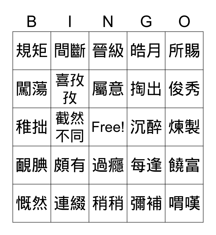 This bingo card has a free space and 24 words: 頗有, 連綴, 屬意, 慨然, 所賜, 規矩, 闖蕩, 間斷, 沉醉, 過癮, 掏出, 稚拙, 每逢, 饒富, 喜孜孜, 彌補, 煉製, 晉級, 俊秀, 截然不同, 喟嘆, 靦腆, 皓月 and 稍稍.