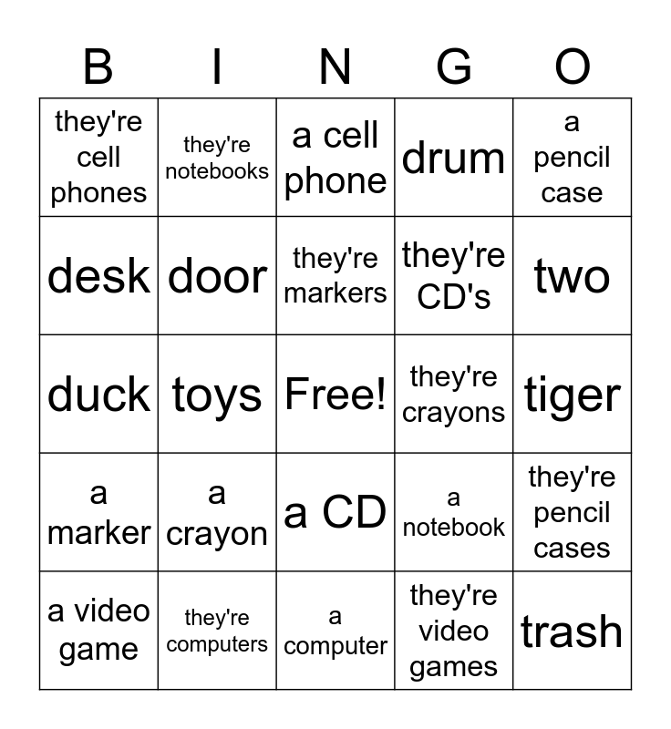 This bingo card has a free space and 24 words: a crayon, they're computers, they're markers, a video game, a pencil case, they're cell phones, desk, they're notebooks, they're crayons, a CD, they're CD's, duck, a notebook, they're pencil cases, door, they're video games, tiger, a cell phone, two, toys, trash, a marker, drum and a computer.