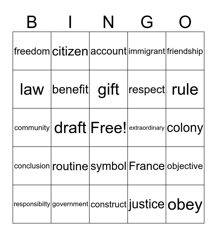 This bingo card has a free space and 24 words: routine, government, gift, responsibilty, friendship, freedom, law, citizen, extraordinary, symbol, respect, community, France, objective, benefit, justice, colony, account, rule, draft, obey, conclusion, immigrant and construct.