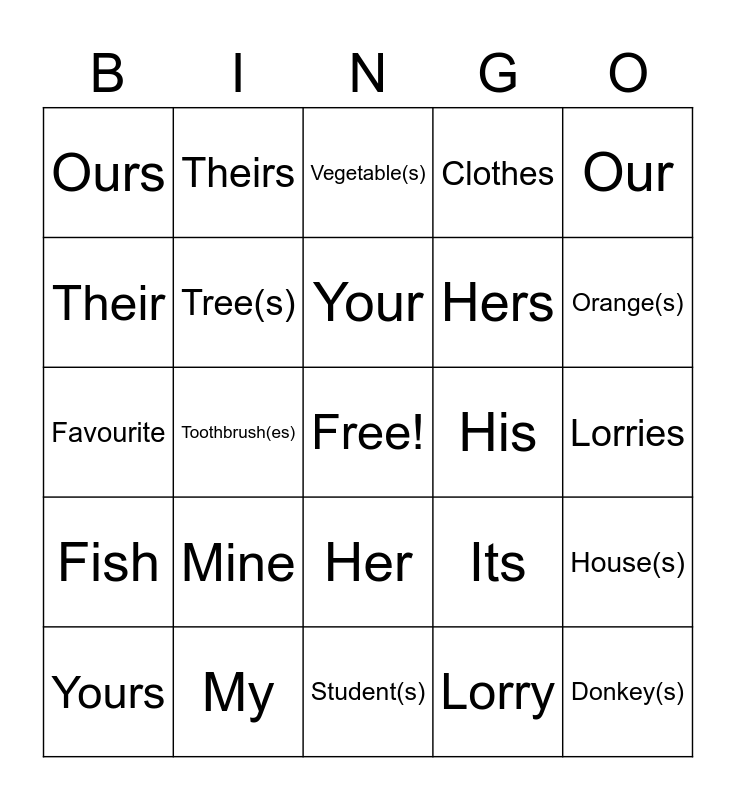This bingo card has a free space and 24 words: Mine, My, Your, Yours, Our, Ours, Their, Theirs, His, Her, Hers, Favourite, Its, House(s), Tree(s), Lorry, Lorries, Vegetable(s), Orange(s), Toothbrush(es), Donkey(s), Fish, Clothes and Student(s).
