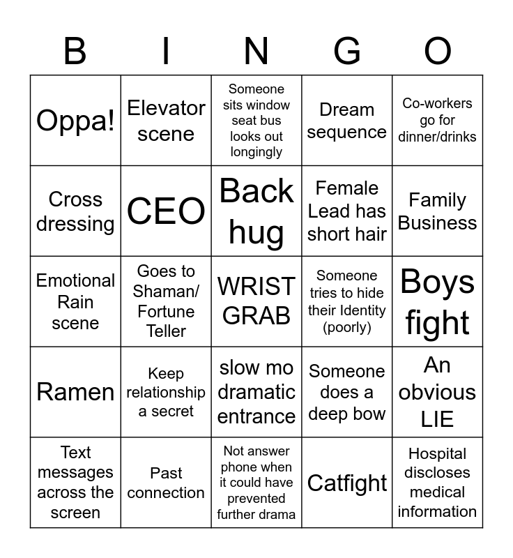 This bingo card has a free space and 24 words: Keep relationship a secret, Past connection, Back hug, Text messages across the screen, Co-workers go for dinner/drinks, Oppa!, Cross dressing, Elevator scene, Someone tries to hide their Identity (poorly), slow mo dramatic entrance, Female Lead has short hair, Emotional Rain scene, Someone does a deep bow, An obvious LIE, CEO, Catfight, Boys fight, Someone sits window seat bus looks out longingly, Family Business, Goes to Shaman/ Fortune Teller, Hospital discloses medical information, Ramen, Dream sequence and Not answer phone when it could have prevented further drama.