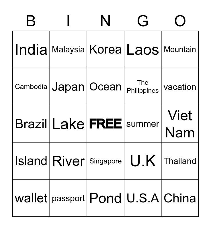 This bingo card has a free space and 24 words: River, passport, Ocean, wallet, Mountain, India, Cambodia, Malaysia, summer, Singapore, The Philippines, Brazil, U.K, Thailand, Japan, U.S.A, Viet Nam, Korea, vacation, Lake, China, Island, Laos and Pond.