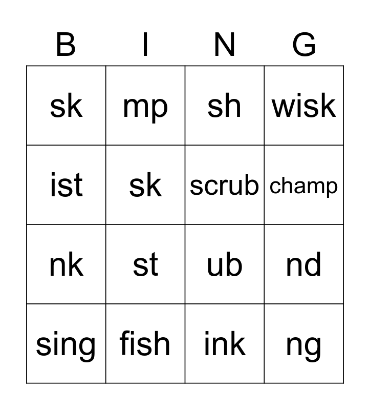 This bingo card has 19 words: ub, ish, sh, ng, nd, ist, ink, sk, mp, nk, st, sk, scrub, fish, sing, land, wisk, champ and must.