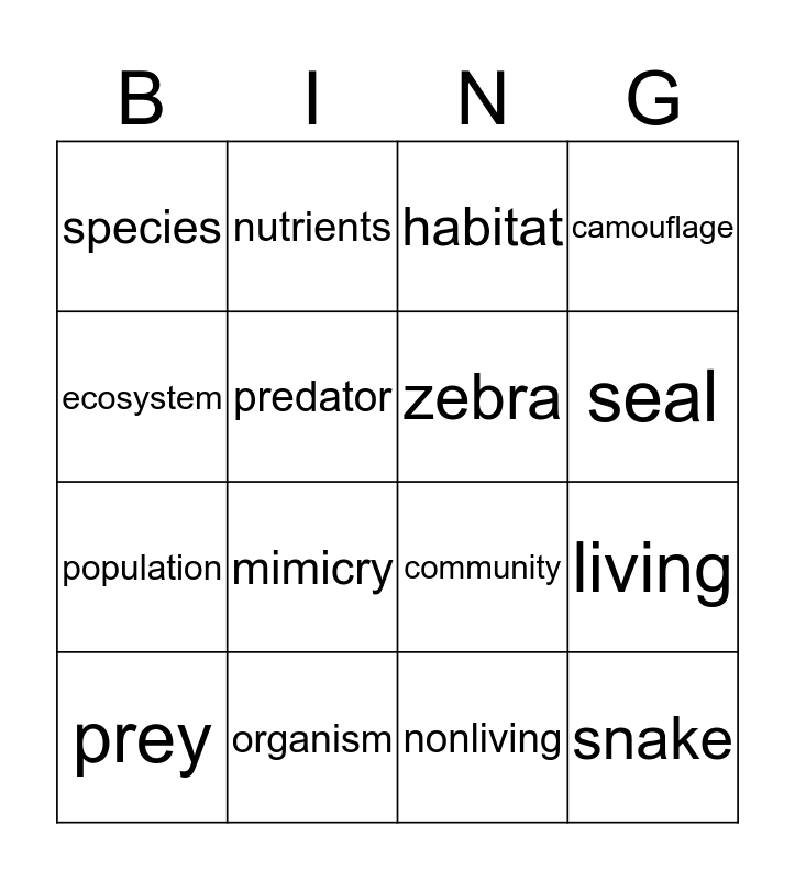 This bingo card has 16 words: organism, living, habitat, species, population, nutrients, community, nonliving, ecosystem, predator, prey, camouflage, mimicry, seal, zebra and snake.