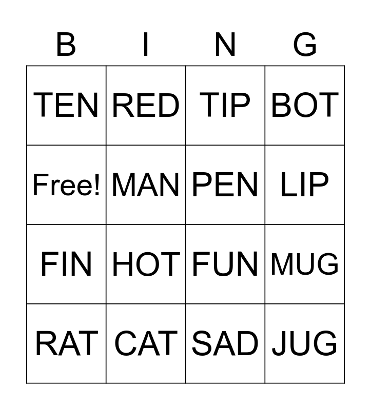 This bingo card has 16 words: CAT, MUG, TIP, TEN, FIN, RED, FUN, SAD, Free!, MAN, RAT, BOT, HOT, LIP, PEN and JUG.