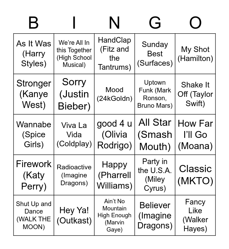 This bingo card has 62 words: Levitating (Dua Lipa), Hey Ya! (Outkast), Bye Bye Bye (*NSYNC), Firework (Katy Perry), Fancy Like (Walker Hayes), We Are Never Ever Getting Back Together (Taylor Swift), Sorry (Justin Bieber), Blinding Lights (The Weeknd), Uptown Funk (Mark Ronson, Bruno Mars), Butter (BTS), Sunday Best (Surfaces), I Gotta Feeling (Black Eyed Peas), Stronger (Kanye West), Clarity (Zedd, Foxes), Ironic (Alanis Morissette), As It Was (Harry Styles), good 4 u (Olivia Rodrigo), My Shot (Hamilton), We Don’t Talk About Bruno (Encanto), Mood (24kGoldn), All Star (Smash Mouth), HandClap (Fitz and the Tantrums), Shut Up and Dance (WALK THE MOON), Believer (Imagine Dragons), Hooked on a Feeling (Blue Swede), Bad Habits (Ed Sheeran), A-O-K (Tai Verdes), Never Gonna Give You Up (Rick Astley), Classic (MKTO), Don’t Stop The Music (Rihanna), I Wanna Dance with Somebody (Whitney Houston), Africa (Toto), Sunroof (Nicky Youre, dazy), Under the Sea (Little Mermain), How Far I’ll Go (Moana), We’re All In this Together (High School Musical), Poker Face (Lady Gaga), Don’t Go Breaking My Heart (Elton John), Viva La Vida (Coldplay), Livin’ On A Prayer (Bon Jovi), Wannabe (Spice Girls), Umbrella (Rihanna), Radioactive (Imagine Dragons), Dancing Queen (ABBA), Shake It Off (Taylor Swift), Party in the U.S.A. (Miley Cyrus), Hey, Soul Sister (Train), You Belong With Me (Taylor Swift), Magic (B.o.B.), Bad guy (Billie Eilish), Happy (Pharrell Williams), Ain’t No Mountain High Enough (Marvin Gaye), Sunflower (Post Malone), High Hopes (Panic! At the Disco), Walking On Sunshine (Katrina and the Waves), ABC (The Jackson 5), Single Ladies (Beyonce), Call Me Maybe (Carly Rae Jepsen), I’ll Be There for You (The Rembrandts), Don’t Stop Believin' (Journey), Since U Been Gone (Kelly Clarkson) and Can’t Stop the Feeling (Justin Timberlake).