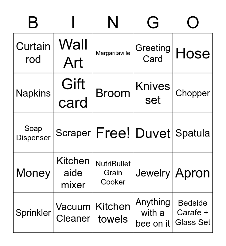 This bingo card has a free space and 25 words: Kitchen aide mixer, Kitchen towels, Broom, Sprinkler, Hose, Curtain rod, Napkins, Wall Art, Duvet, NutriBullet Grain Cooker, Knives set, Soap Dispenser, Jewelry, Apron, Gift card, Coffee mug, Spatula, Margaritaville, Chopper, Scraper, Bedside Carafe + Glass Set, Vacuum Cleaner, Money, Greeting Card and Anything with a bee on it.