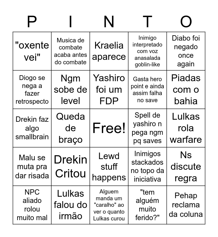 This bingo card has a free space and 24 words: Drekin Critou, Lulkas falou do irmão, Yashiro foi um FDP, NPC aliado rolou muito mal, Diabo foi negado once again, "oxente vei", Diogo se nega a fazer retrospecto, Musica de combate acaba antes do combate, Spell de yashiro n pega ngm pq saves, Lewd stuff happens, Gasta hero point e ainda assim falha no save, Drekin faz algo smallbrain, Inimigos stackados no topo da iniciativa, Ns discute regra, Ngm sobe de level, "tem alguém muito ferido?", Lulkas rola warfare, Kraelia aparece, Piadas com o bahia, Queda de braço, Pehap reclama da coluna, Malu se muta pra dar risada, Inimigo interpretado com voz anasalada goblin-like and Alguem manda um "caralho" ao ver o quanto Lulkas curou.