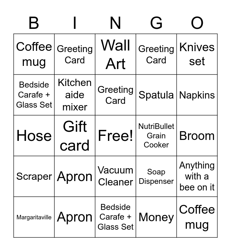 ⚠ This card has duplicate items: Kitchen aide mixer (4), Kitchen towels (4), Broom (4), Sprinkler (4), Hose (4), Curtain rod (4), Napkins (4), Wall Art (4), Duvet (4), NutriBullet Grain Cooker (4), Knives set (4), Soap Dispenser (4), Jewelry (4), Apron (4), Gift card (4), Coffee mug (4), Spatula (4), Margaritaville (4), Chopper (4), Scraper (4), Bedside Carafe + Glass Set (4), Vacuum Cleaner (4), Money (4), Greeting Card (4), Anything with a bee on it (4)